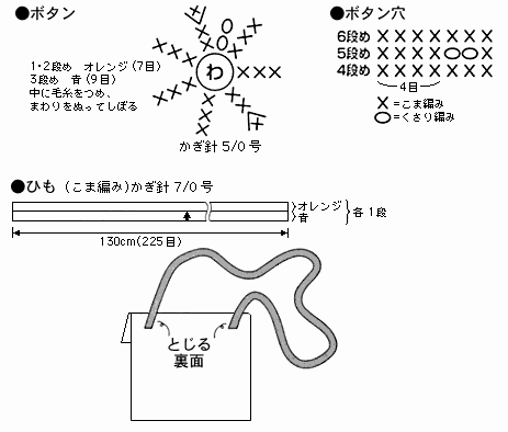 | 5 模様編み部分を2つに折りバックこま編みで袋にし、続けてフタの部分を編み、反対側 も袋にします。 |